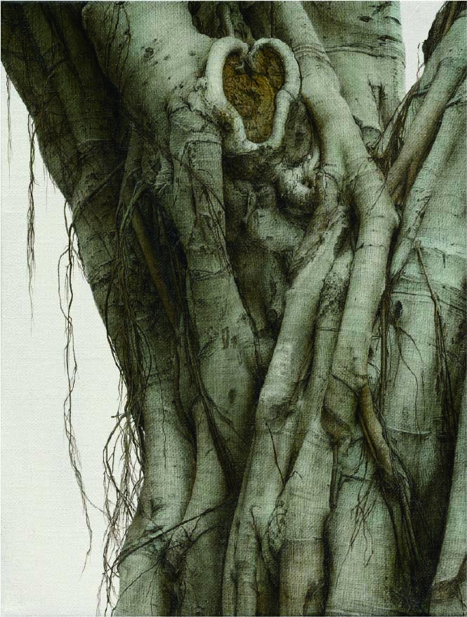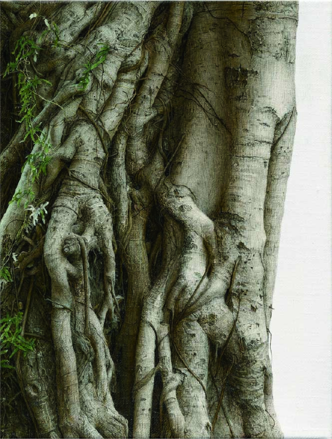 作為台灣最強勢與影響力發展的當代藝術團體 -「悍圖社」的重要成員與健將的陸先銘,現為新任「悍圖社」會長,他的作品在過往以描繪台灣的“陸橋”創作聞名,這幾年發展新的「榕樹」系列繪畫卓然有成,透過他細膩逼真描繪的老榕樹,在光影氛圍烘托下,刻意省略繁縟背景,單純的榕樹意象反而凸顯出植物本身的內蘊而令人驚嘆。
