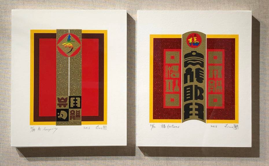 廖修平,(左)《壽》,18 x 14 cm /(右)《福》,17 x 16.5 cm,絲網版畫,2016。圖/非池中藝術網攝