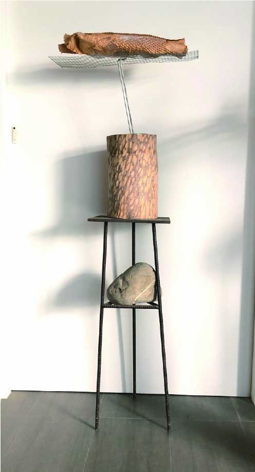 藝術家蔡根(1954-),從最早期的泥塑、木雕到近期的複合媒材,可以看見他對於立體造型的深刻體悟。本次展出的作品從木雕出發,與剛硬的金屬、著厚重的石材以及輕盈的紙捲對話。多媒材的揉合甚至是光影的變化,讓本來不具意義的個體,轉化成為反覆解構重組、增減的過程。呈現出了富有人性溫度的造型藝術。