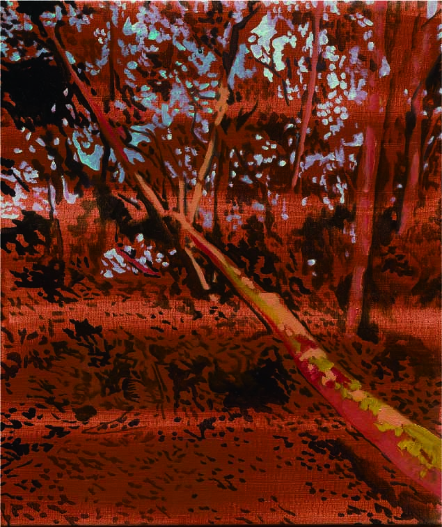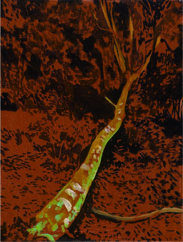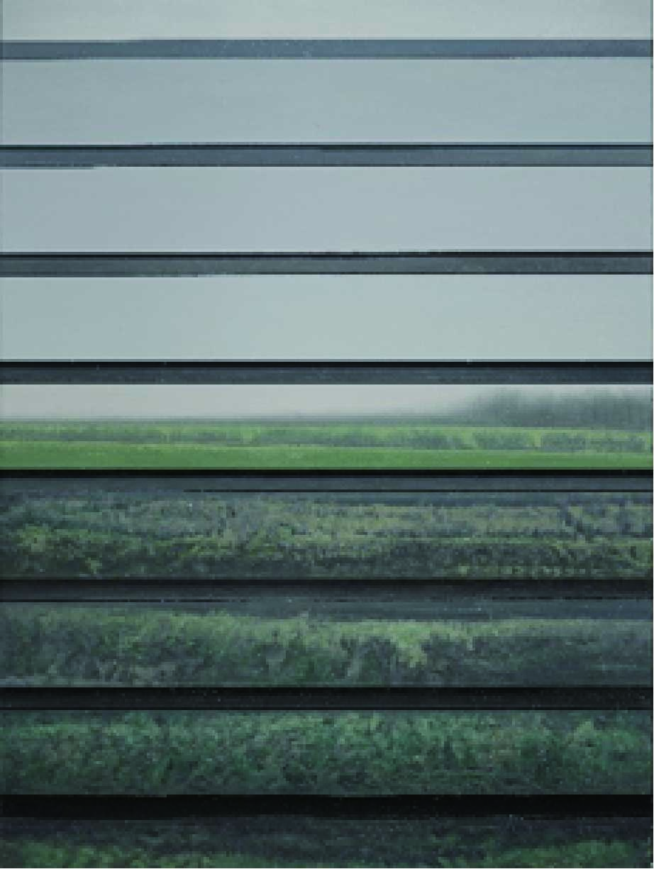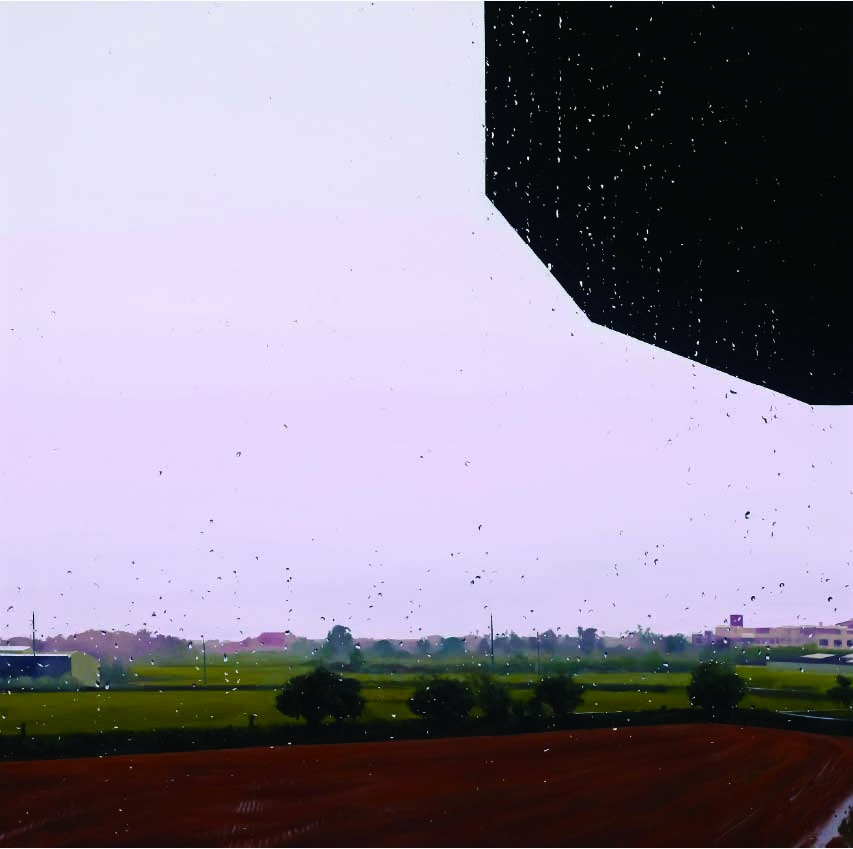 同樣援引隨手拍下的影像資料,廖震平則以緩慢地回歸繪畫創作,來提供他再次專注觀看日常風景的機會。在他作品畫面中經常得見,那些看似突兀的橋、窗或樹幹,不但暗示了不同觀看方式的轉變所引發的扞格,也讓人更加好奇那些蔓延在畫面以外的事件、氣息與氛圍,進而形成某種奇特的對望與對話。