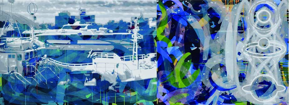 陳崑鋒將往返東港與小琉球之間的交通船轉化濃縮成個人的精神印記,試圖透過創作去釐清自己與這個懸立於屏東外海的小島之間的關係──不全然是陸地的,而是涵蓋了海洋在內,游移卻更加遼闊,既親密又略帶疏離的生命連結,進而低調且溫情地召喚著一些難以再現的美好過往。林賢俊將關注的焦點放在既是風景,也可視之為物件,且從來無從被眼睛捕捉的雲朵上面。以此為出發,其作品畫面所展示出來的實際上同時擁有具象與抽象雙重面向,而看似理性操作的結果,卻也默默地含藏了內在情感的隱喻修辭。