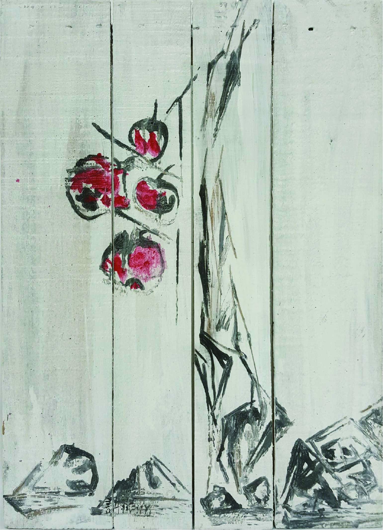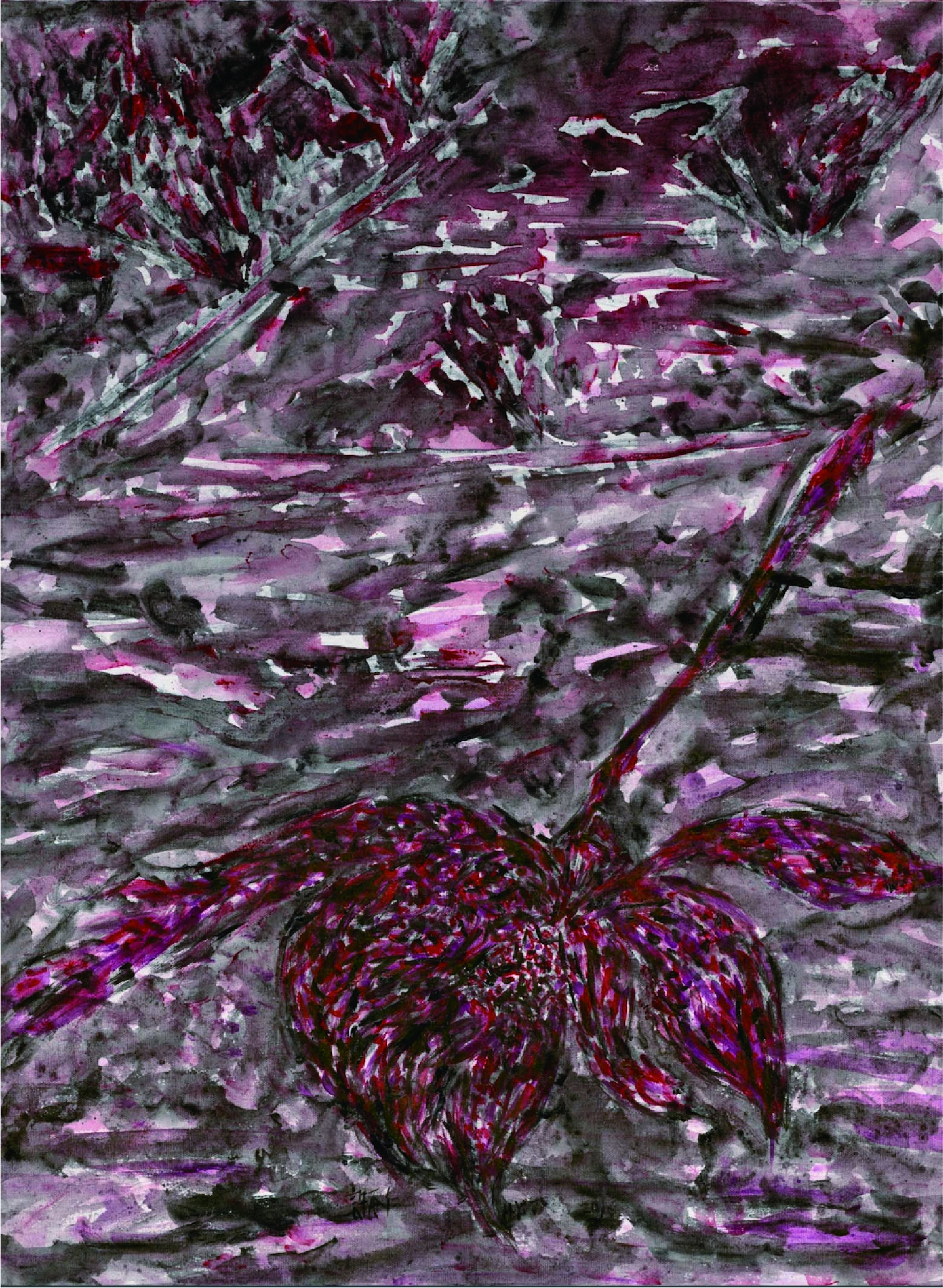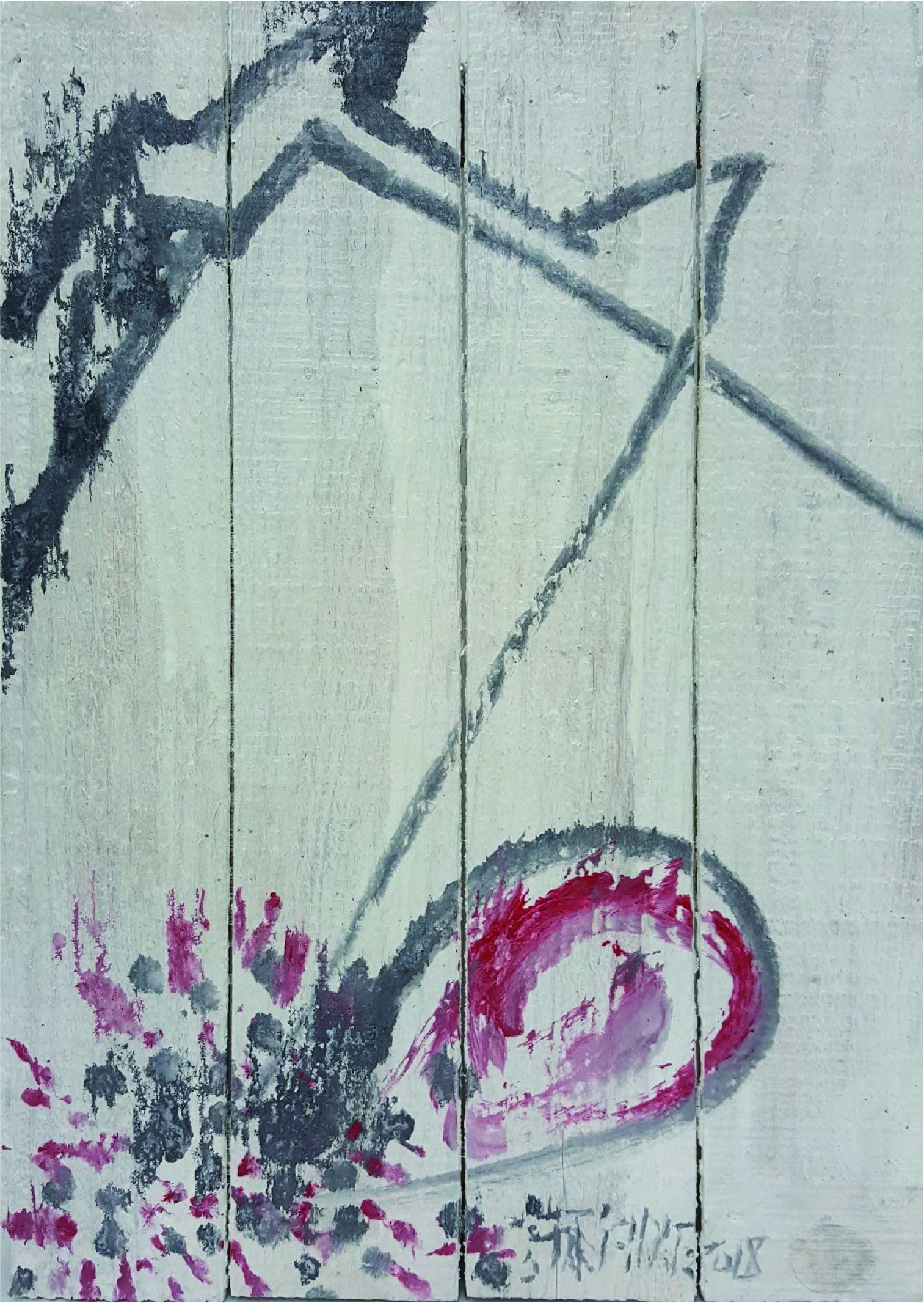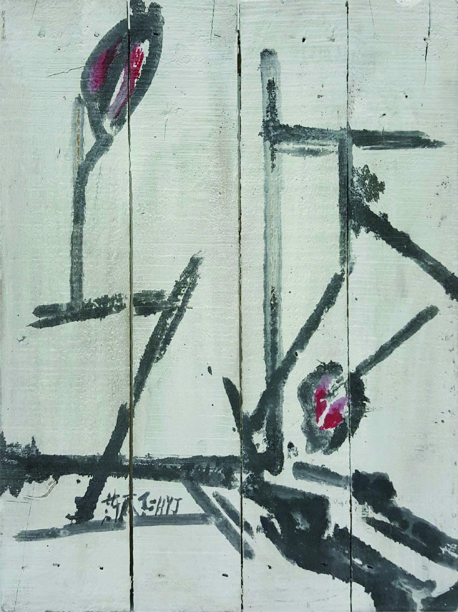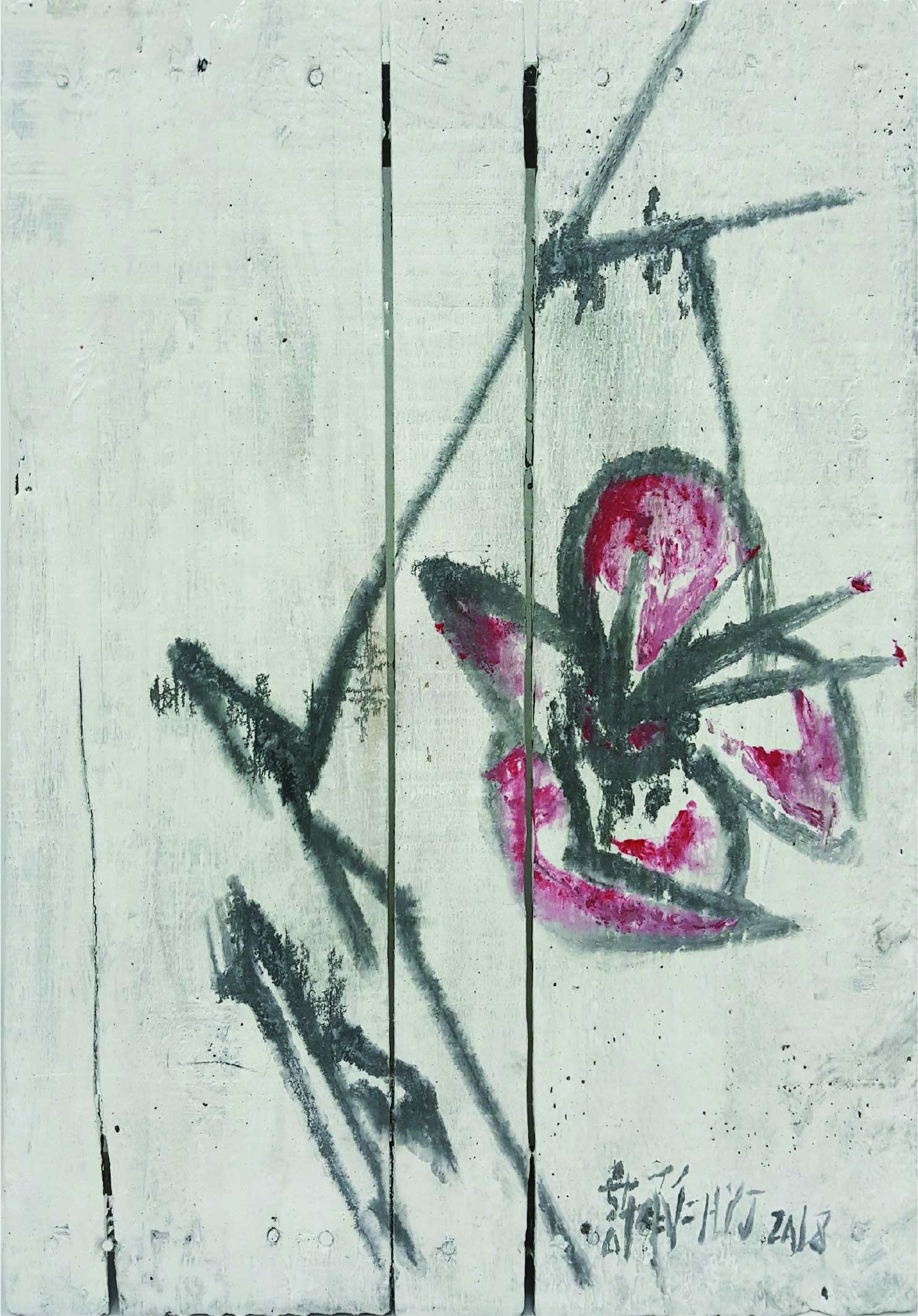 許雨仁先生甫在2024年由北美館策劃《溺浮沉洄:許雨仁回顧展》,其創作面貌風格早有多重論述,針對「驚蟄」策展主題意象,此次擇其與土地及植物關懷畫作31件,展出《粗筆系列》(Rough-brush Ink Plants Series,2007-2014,水墨、紙)、《沒形系列》(Shapeless Series,複合媒材、壓克力片、炭、墨、膠、塑膠布,2015-2021)、《豆腐板書畫系列》(Color Ink Painting onTofu Pallet Series,壓克力、墨,2015-2018)、《彩筆系列》(Color Painting Series,2016,複合媒材、畫布)等四個系列作品。見諸他熱衷倘佯自然之間,對植物成長生機追尋亦多有著墨、終其一生對生長土地周遭環境的關懷反映。藝術家從作品反映問題,透過多重媒材包含水墨、紙、複合媒材、畫布及筆墨表現的新創,具有當代創新觀點,其中「細筆斷續線」為其獨特風格表徵,畫面大量留白更顯示其對傳統水墨中留白布局的體悟體現,對比張力下,風格令人過目難忘。
