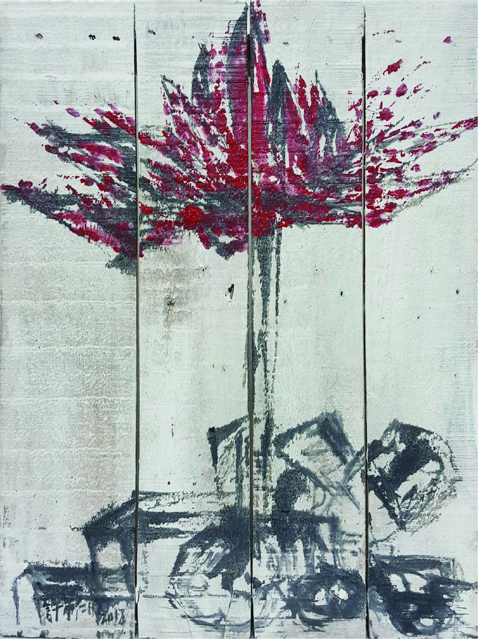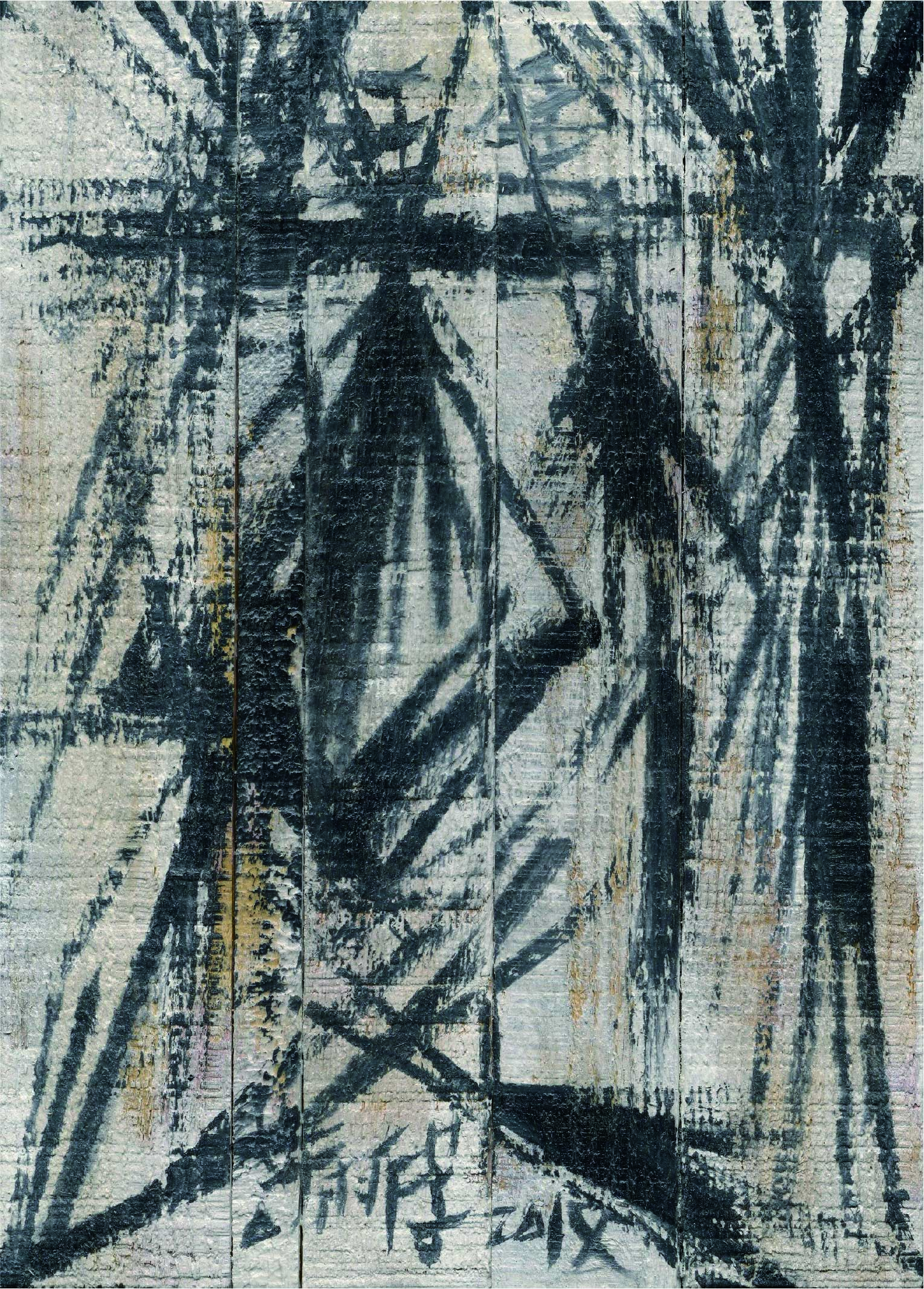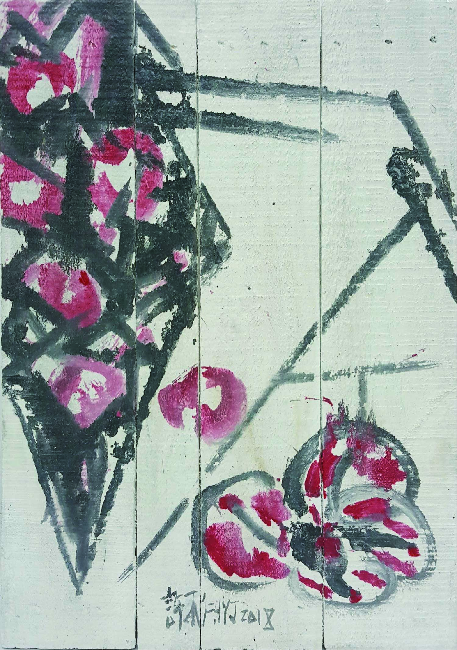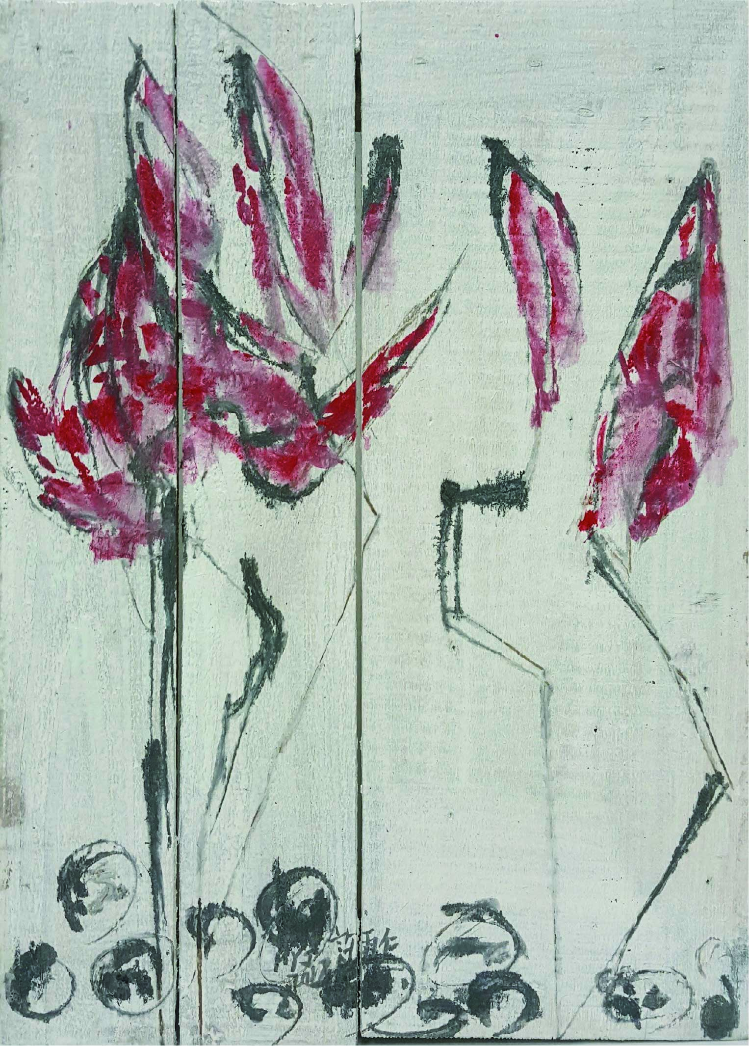 許雨仁先生甫在2024年由北美館策劃《溺浮沉洄:許雨仁回顧展》,其創作面貌風格早有多重論述,針對「驚蟄」策展主題意象,此次擇其與土地及植物關懷畫作31件,展出《粗筆系列》(Rough-brush Ink Plants Series,2007-2014,水墨、紙)、《沒形系列》(Shapeless Series,複合媒材、壓克力片、炭、墨、膠、塑膠布,2015-2021)、《豆腐板書畫系列》(Color Ink Painting onTofu Pallet Series,壓克力、墨,2015-2018)、《彩筆系列》(Color Painting Series,2016,複合媒材、畫布)等四個系列作品。見諸他熱衷倘佯自然之間,對植物成長生機追尋亦多有著墨、終其一生對生長土地周遭環境的關懷反映。藝術家從作品反映問題,透過多重媒材包含水墨、紙、複合媒材、畫布及筆墨表現的新創,具有當代創新觀點,其中「細筆斷續線」為其獨特風格表徵,畫面大量留白更顯示其對傳統水墨中留白布局的體悟體現,對比張力下,風格令人過目難忘。